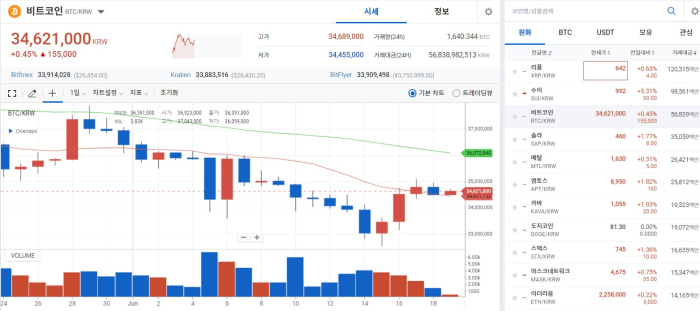 ◇비트코인 = 19일 오후 5시 업비트 기준 비트코인(BTC) 가격은 3462만원을 기록 중이다. 비트코인 점유율(도미넌스)은 49.69%를 보였다.